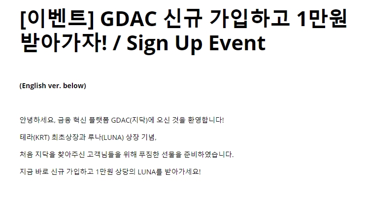 지금 신규 가입시 1만원 상당의 LUNA 코인을 받으실수 있다고 합니다
